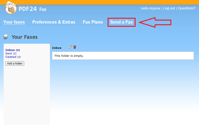 ①PDF24 FAXのマイページにログインし、上部メニューの「Send a Fax」をクリックする