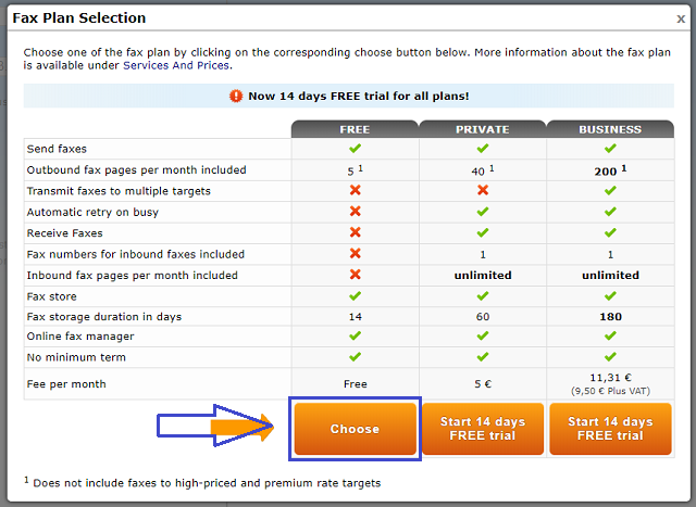 ⑤「Fax Plan Selection」の画面が表示されるので、FREEの「Choose」をクリックする