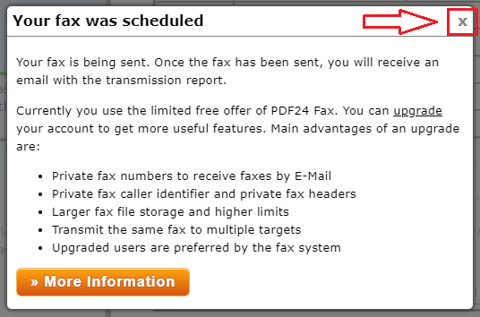 ⑥「Your fax was scheduled」が表示されるので、「×」を押して送信スタンバイの完了
